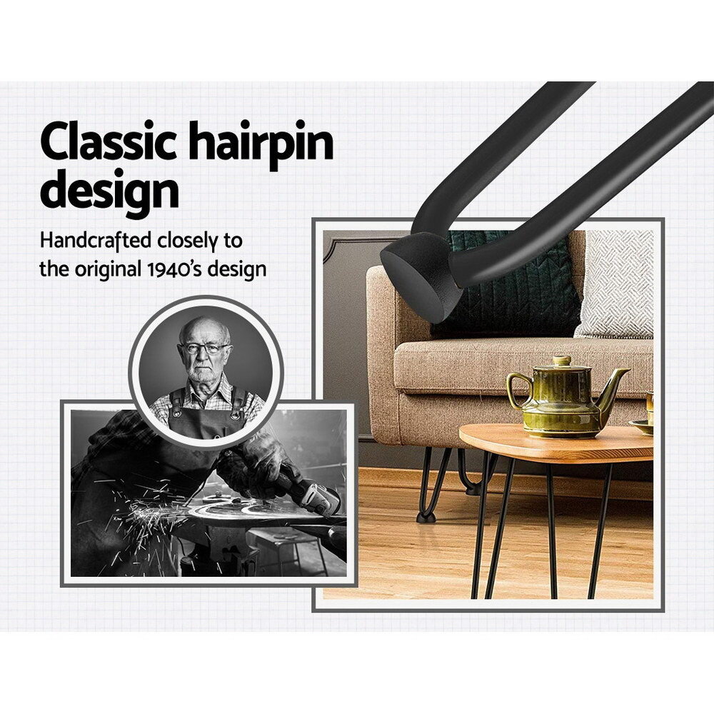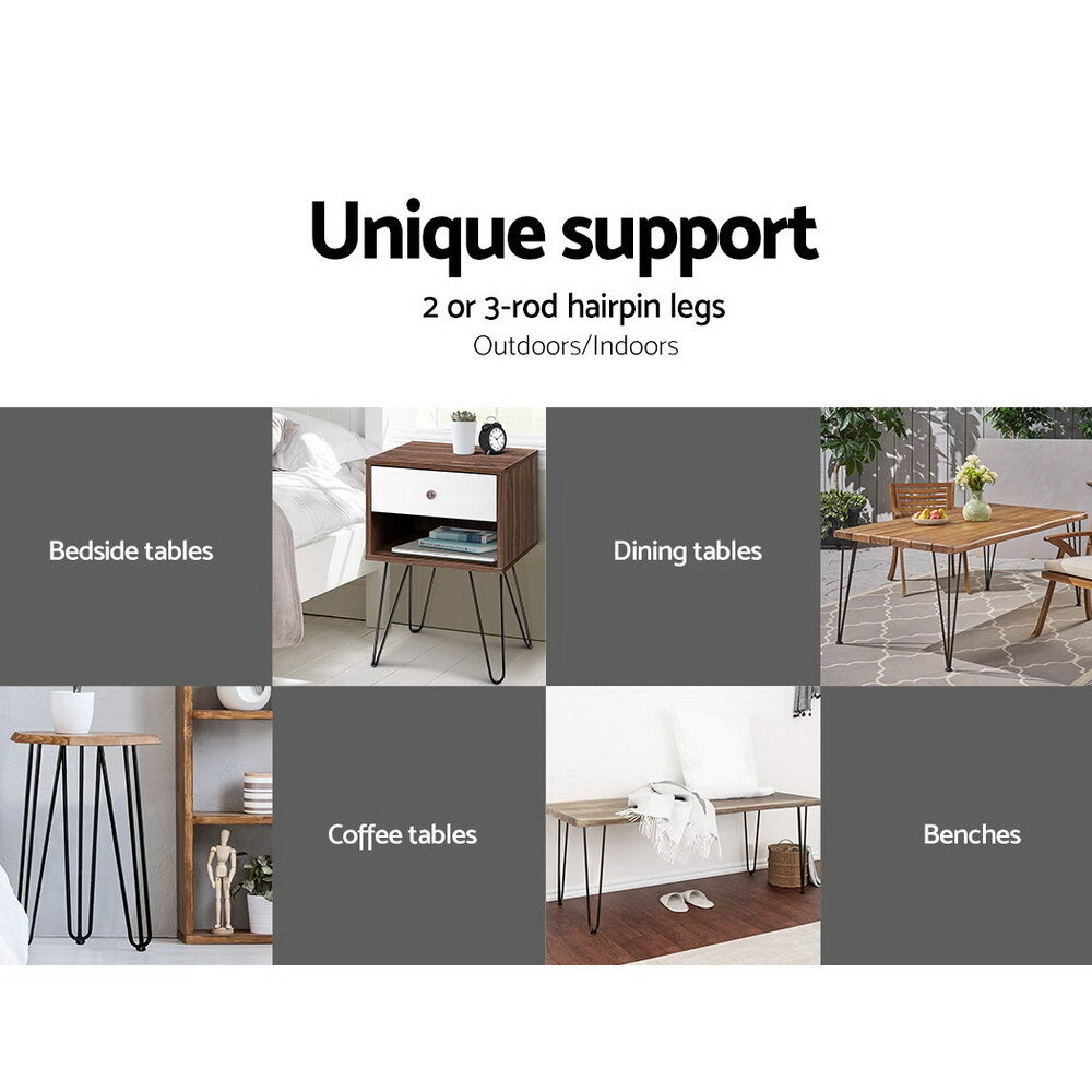 Sold OutGive your existing furniture a makeover or build your own completely from scratch with our Artiss Table Leg, for a one-and-only design. The tough anti-rust powder-coated metal hairpin leg will lend some on-trend industrial cred to any ensemble. Made of premium iron with a diameter of 13mm for each rod, the table leg is durable and able to withstand robust use. Unlike similar designs sold by others, our hairpin table leg has a solid triangular bracket that bears load evenly to provide sturdy and steady support. A flat foot can be attached to each leg for a firmer stand and to prevent scratches on your pristine floor. Attach the table leg to bedside tables, coffee tables, dining tables, benches or any kind of furniture that would be enhanced with some unique support.