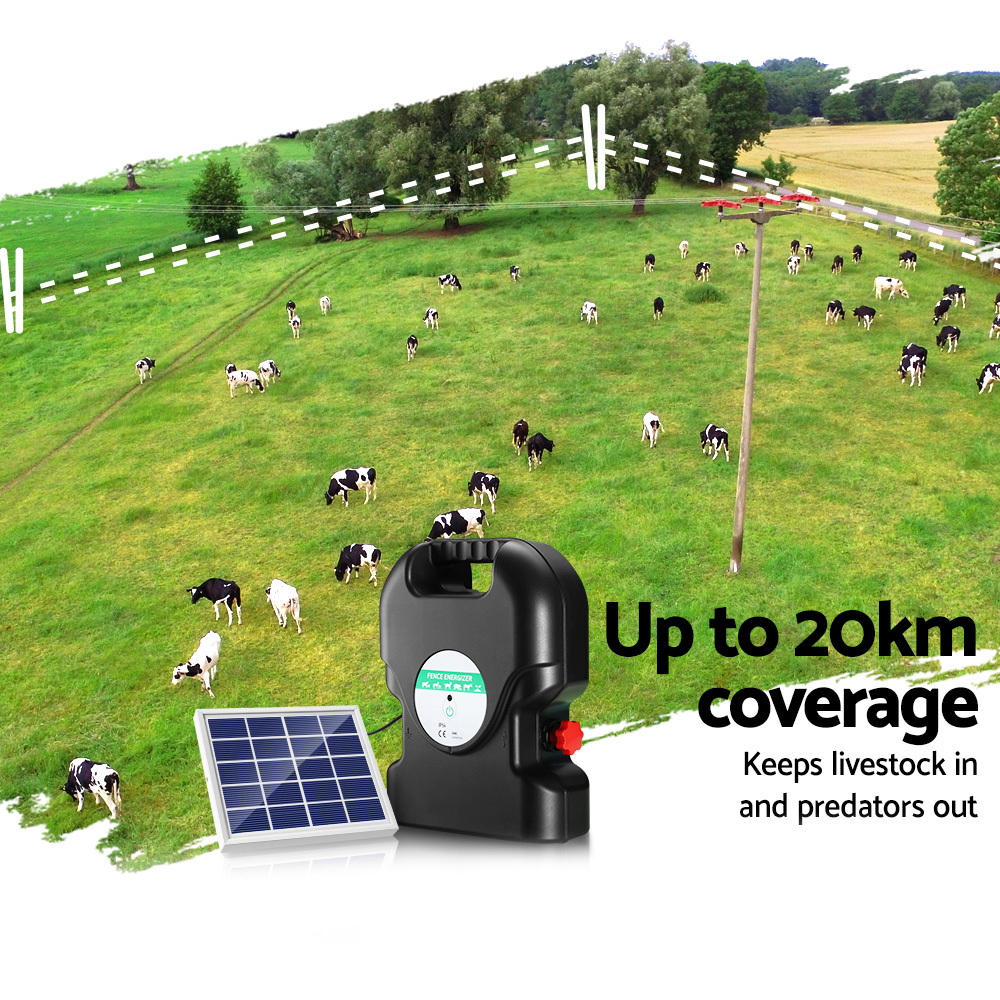 In StockEver worried about livestock and animals escaping your property? This Solar Electric Fence Energiser is the ideal product for you. Whether for the farm or just around your suburban home, the solar fence energiser can perform effectively in either environment. The unit charges using solar power, but in case of poor weather a fully charged battery lasts for up to 20-29 sunless days. No need to worry about the rain; the energiser is also waterproof. If the fence is activated by an animal, the unit will generate a brief pulse as the voltage will drop from 8KV to 1.5KV to prevent harmful electric shocks. Featuring a simple installation design, you can have it up in a matter of minutes. Compact, lightweight and versatile, the soar fence energiser is an effective low maintenance solution to protect your property and livestock.