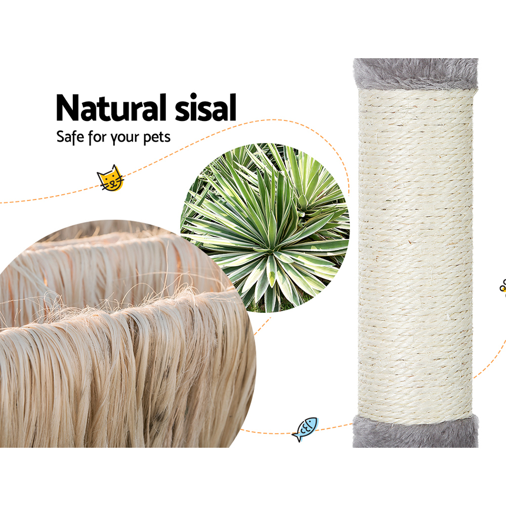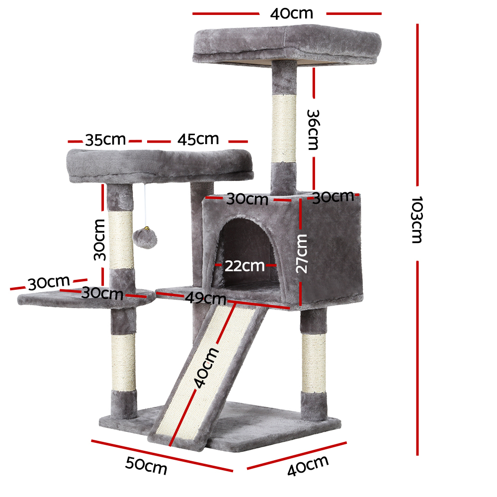 In StockA purrfect way to keep your cats entertained! Our i.Pet Cassey medium-sized cat trees cater to your feline friend's scratching instinct and playtime and provide enough space to relax and nap. It's absolutely a feline wonderland. Our cat trees feature a bed cubicle, a hanging activity ball, a ladder, and platforms at varying heights for tom and tabby to have hours of fun scratching, hunting, climbing, jumping, hopping, and playing with favourites or simply lounging around. Additionally, with its sisal-covered scratching post, you can rest assured that your furniture will stay scratch-free. It also has comfortable velvet upholstered surfaces, ideal for napping after a long playtime. For your peace of mind, our cat trees boast a firm base and sturdy wood construction. This ensures good stability and durability. With so many playing and napping spots, our Cassey cat tree is just right for your cat to have its energetic exploration.