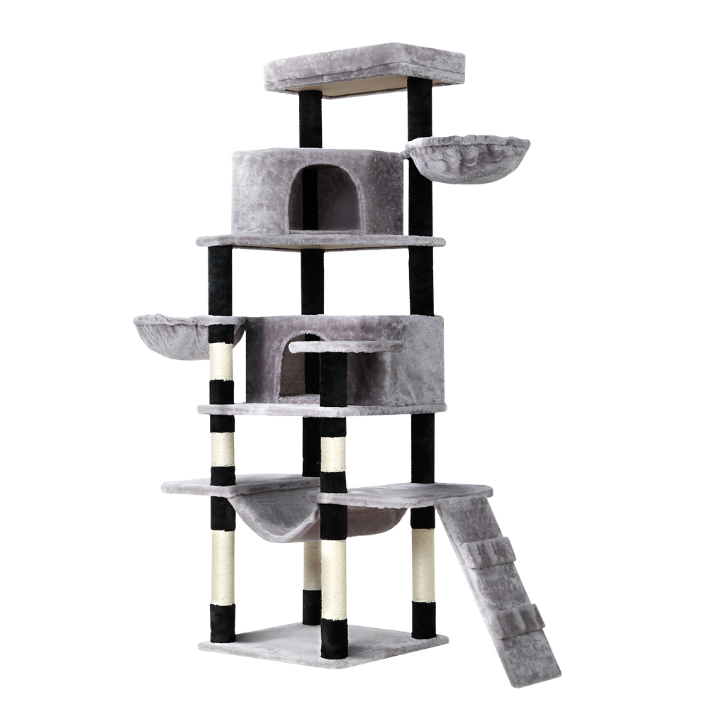 In StockA purrfect way to keep your cats entertained! Our i.Pet Fela large-sized cat trees cater to your feline friend's scratching instinct and playtime and provide enough space to relax and nap. It's absolutely a feline wonderland. Our cat trees feature bed cubicles, side sleeping hammocks, cradle, ladder, and platforms for tom and tabby to have hours of fun scratching, hunting, climbing, jumping, hopping, and playing with favourites or simply lounging around. Additionally, with its sisal-covered scratching posts, you can rest assured that your furniture will stay scratch-free. It also has comfortable velvet upholstered surfaces, ideal for napping after a long playtime. For your peace of mind, our cat trees boast a firm base and sturdy wood construction. This ensures good stability and durability. With so many playing and napping spots, our Fela cat tree is just right for your cat to have its energetic exploration.